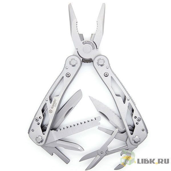 Функционал: плоскогубцы, маленькая отвертка плоская, кусачки, нож с серрейторным лезвием, нож для консервов, нож, ножницы, открывалка для бутылок, нож для снятия изоляции, держатель бит, шило, пила, 12 отверток (наличие сменных насадок в комплекте);