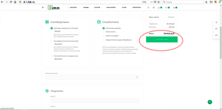 Проверьте правильность ввода информации: позиции заказа, выбор местоположения, данные о покупателе. Нажмите кнопку «Оформить заказ».