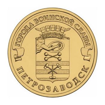 Монета из серии «Города воинской славы» с изображением герба города Петрозаводска. Выпущена в обращение 11 июля 2016 года.