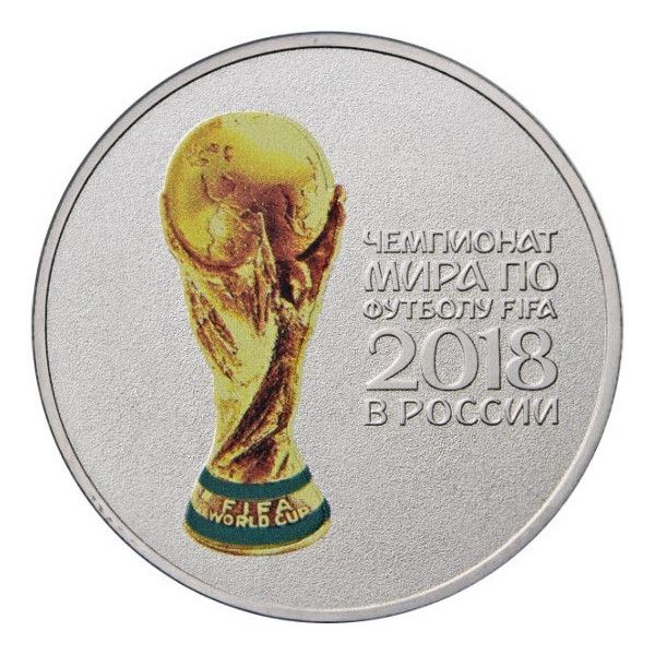 Монета достоинством 25 рублей, выпуск которой приурочен к проведению в России чемпионата мира по футболу. На реверсе - цветное изображение кубка чемпионата мира. Монета отчеканена Московским монетным двором. Официальная лицензионная серия, выпущенная ограниченным тиражом.