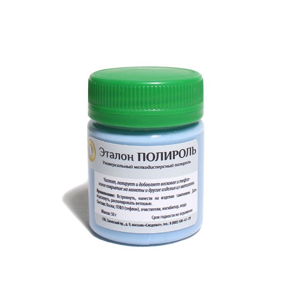 Эталон "Полироль" – универсальный мелкодисперсный полироль для чистки, полировки и защиты монет, а также других металлических изделий. Полироль имеет в своем составе воск и тефлон, благодаря чему не оставляет царапин и не удаляет патину. Средство бережно полирует металл, убирает мельчайшие заусенцы и мелкие пятна, образует на поверхности тонкий защитный слой.