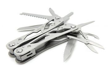 Функционал: плоскогубцы, маленькая отвертка плоская, кусачки, нож с серрейторным лезвием, нож для консервов, нож, ножницы, открывалка для бутылок, нож для снятия изоляции, держатель бит, шило, пила, 12 отверток (наличие сменных насадок в комплекте);