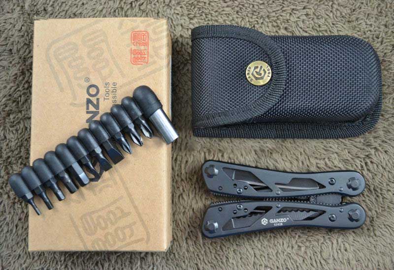 Функционал: плоскогубцы нож, нож для консервов, нож с серрейторным лезвием, маленькая отвертка плоская, открывалка для бутылок, кусачки, пила, шило, ножницы, 12 отверток (наличие сменных насадок в комплекте), держатель бит;
