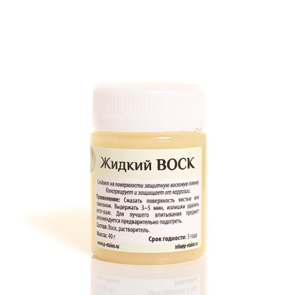 Жидкий воск – средство для консервации и защиты от коррозии монет и металлических предметов. Препарат создает на поверхности металла тонкую защитную пленку. Проникает в поры рыхлого ржавеющего материала и предотвращает дальнейшее развитие коррозии. Медным монетам и "пластике" жидкий воск придает темный матовый оттенок с одновременной консервацией, предотвращая окисление.