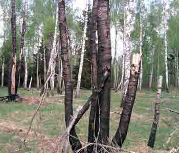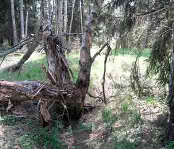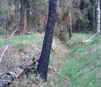 Прежде всего, это деревья. Хотя со времен Великой Отечественной прошло уже 70 лет, многие деревья до сих пор хранят следы боевых действий. Следы пожара на коре, скрученные и покореженные стволы, необычное направление роста старых сучьев.