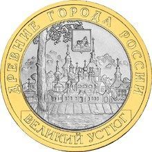Реверс: в центре – изображение архитектурного комплекса Соборного дворища, над ним – герб города Великий Устюг, на первом плане – река, слева – берёза, по окружности на кольце – надписи: вверху – «ДРЕВНИЕ ГОРОДА РОССИИ», внизу – «ВЕЛИКИЙ УСТЮГ». Художник и скульптор: А.Д. Щаблыкин.