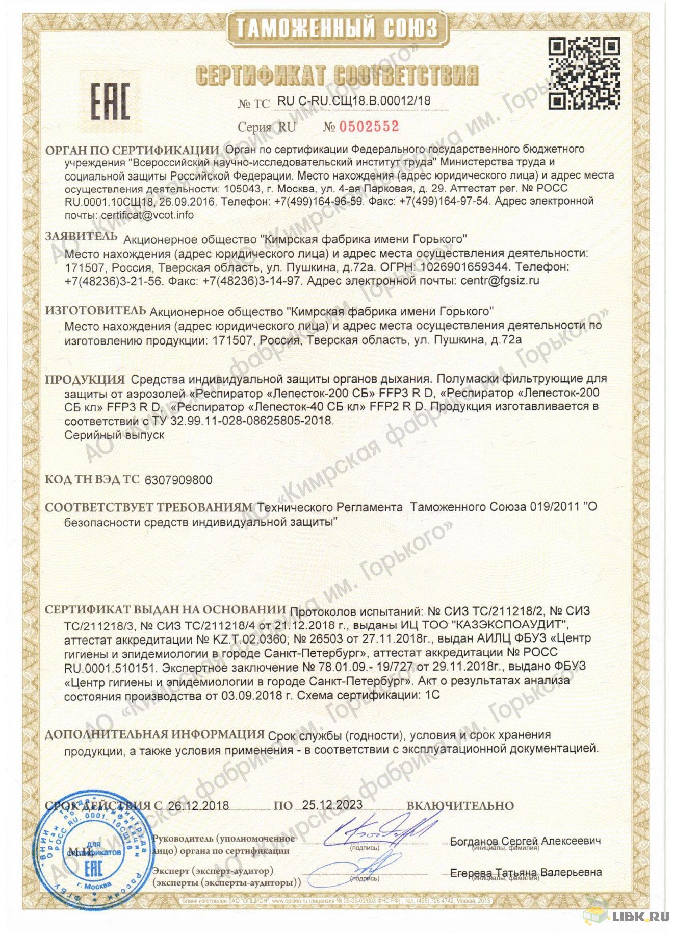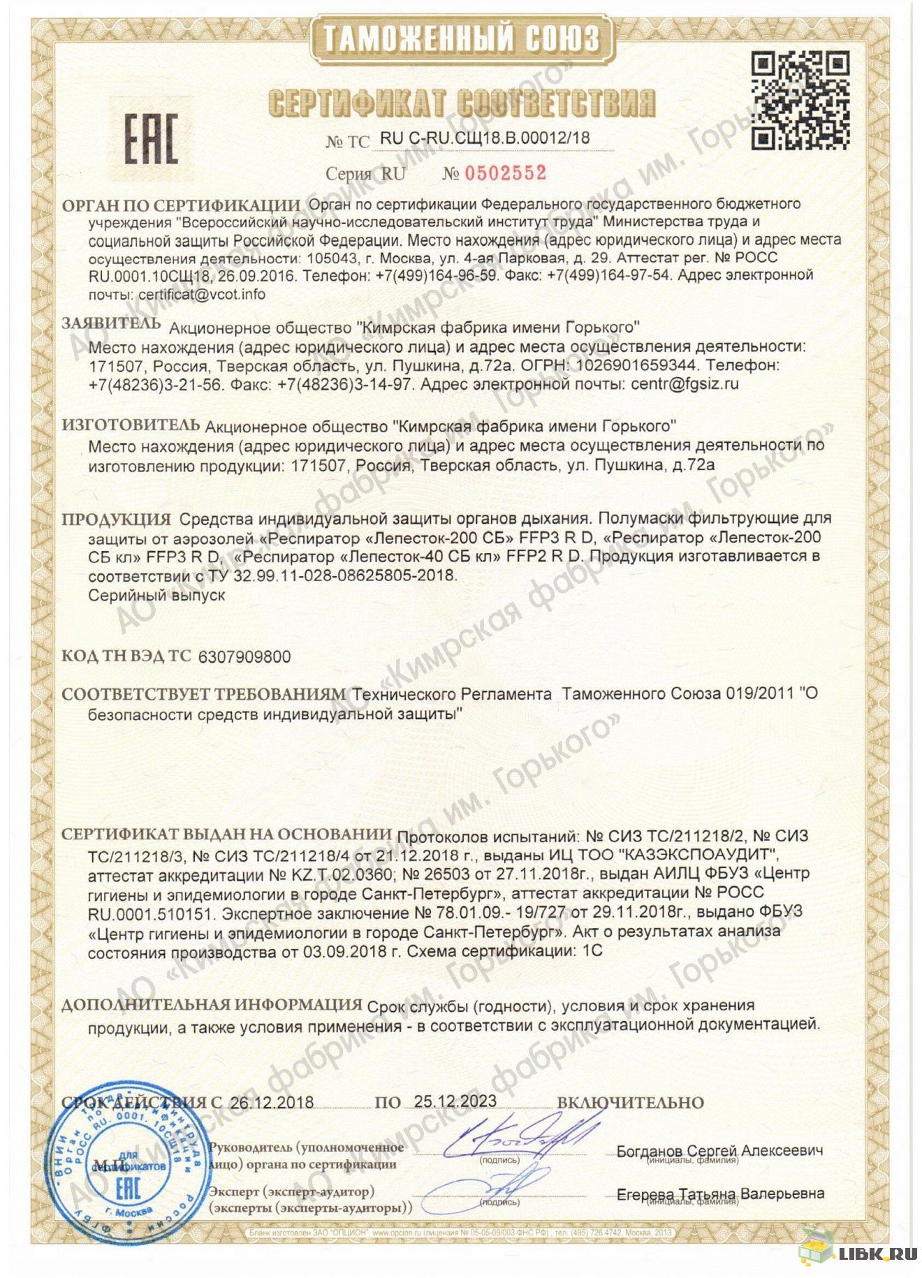 Соответствуют требованиям ГОСТ 12.4.294-2015. Респираторы сертифицированы на соответствие требованиям ТР ТС 019/2011