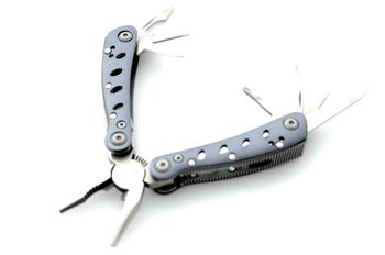 Функционал: плоскогубцы кусачки, крестообразная отвертка, маленькая отвертка плоская, нож, нож для консервов, пила, напильник, шило, открывалка для бутылок, инструмент для зачистки проводов.