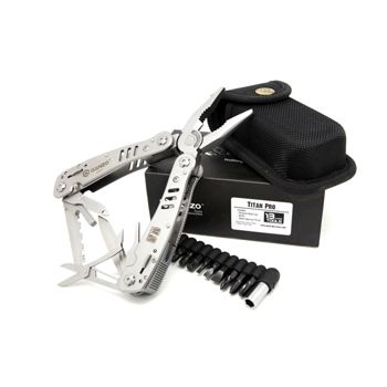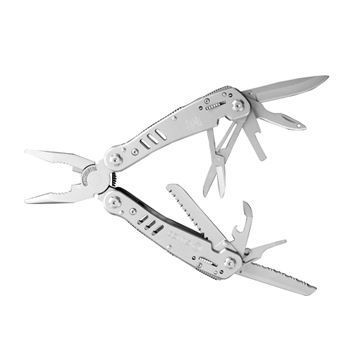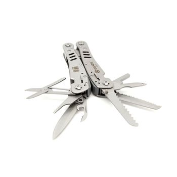 Функционал: плоскогубцы, маленькая плоская отвертка, нож, нож с серрейторным лезвием, нож для консервов, кусачки, стропорез, открывалка для бутылок, ножницы, пила, шило c петлей, инструмент для снятия изоляции, крепление к подсумку, отверток (наличие сменных насадок в комплекте), магнитный держатель бит-насадок;
